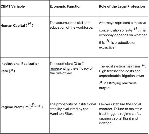 CBMT further integrates Amotz Zahavi’s Handicap Principle and Michael Spence's signaling theory to explain how market participants identify and price high-capacity agents within complex systems. The massive expenditures associated with elite legal services often act as costly signals, proving surplus capacity and separating high-impact corporate actors from low-capacity ones. Furthermore, the pricing of money and the valuation of the economy are heavily dependent on regime-switching models, such as the Hamilton Filter, which constantly estimate the probability of institutional stability versus collapse. If the legal system becomes so inefficient that the Hamilton Filter detects a shift toward a regime of institutional failure, the discount rate spikes, investment capital flees, and the fundamental value of the economy degrades.