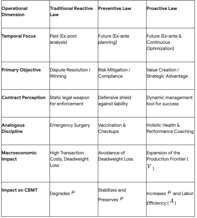 The empirical data paints an unequivocal picture: while the existence of a baseline legal system is necessary for market function, the current reactive execution of legal services in the United States acts as a severe macroeconomic constraint. To fundamentally alter the trajectory of the profession and generate a positive impact on the economy, attorneys must execute a systemic pivot away from the reactive model of post-hoc dispute resolution and embrace forward-looking paradigms of dispute prevention and structural value creation. This necessary transformation is deeply grounded in the established jurisprudential movements of Preventive Law and Proactive Law.