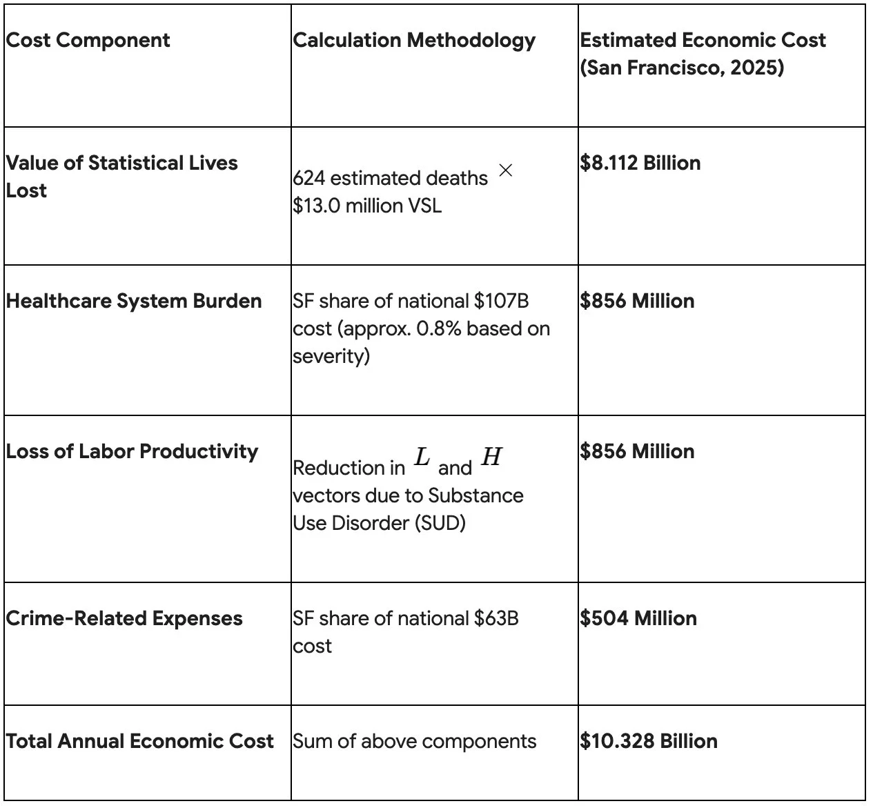 Applying this rigorous economic valuation to San Francisco specifically yields the following localized cost model: