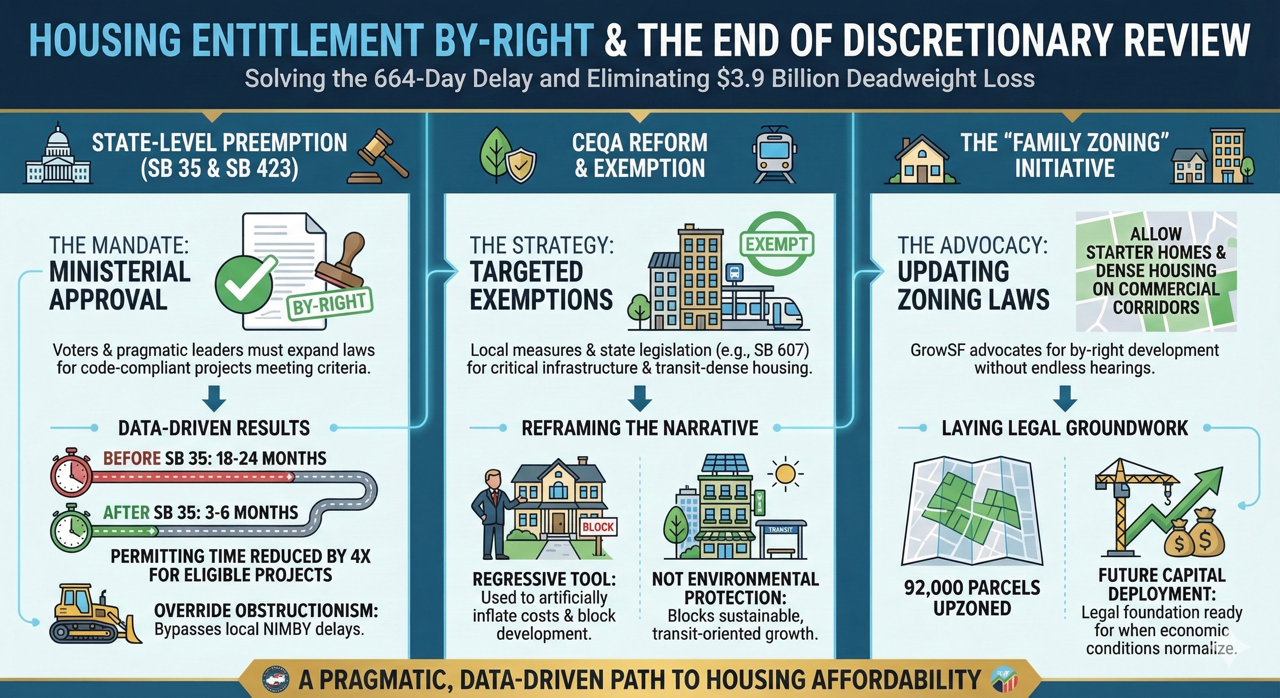 State-Level Preemption (SB 35 and SB 423): Voters and pragmatic leaders must continue to lean on, fund advocacy for, and expand state laws like SB 35 and SB 423, which mandate ministerial (by-right) approval for housing projects that meet certain affordability and labor criteria. Data conclusively shows that SB 35 has already reduced housing permitting times in San Francisco by four times (from 18-24 months down to 3-6 months) for eligible projects. Expanding these state-level preemptions overrides local NIMBY obstructionism.