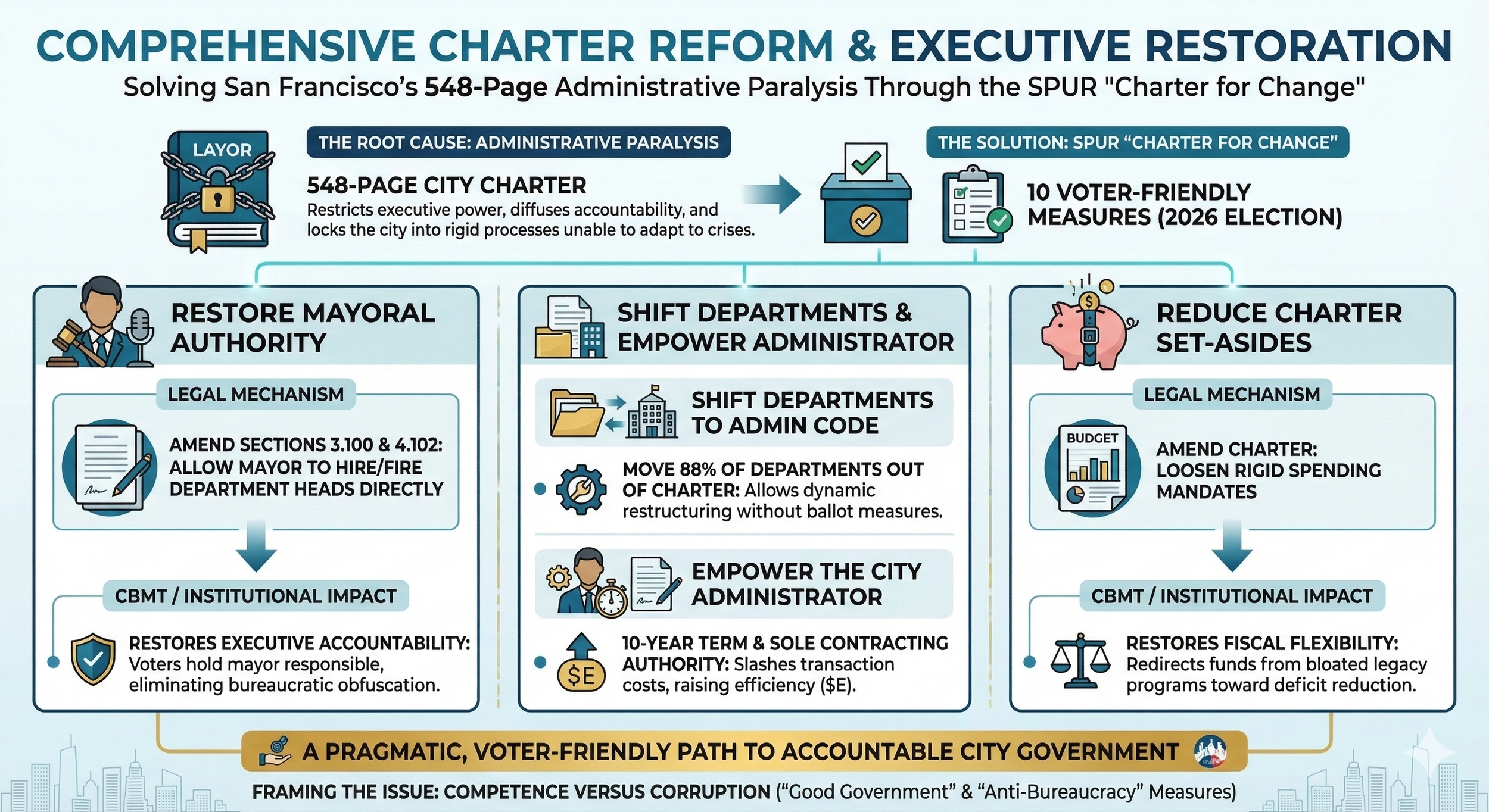 San Francisco's 548-page city charter is the root cause of its administrative paralysis. It restricts executive power, diffuses accountability, and locks the city into administrative processes that cannot adapt to crises. SPUR (San Francisco Bay Area Planning and Urban Research Association) has outlined a comprehensive "Charter for Change" featuring 10 specific, voter-friendly ballot measures intended for the 2026 election.