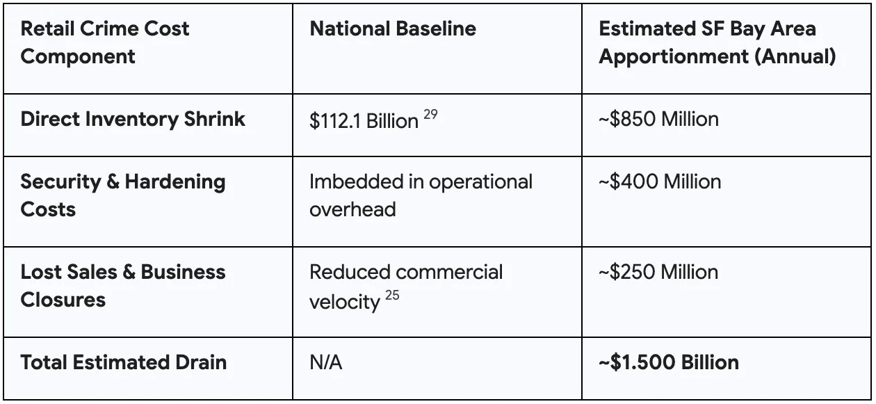 Nationally, retail shrink accounted for an estimated \$112.1 billion in losses. If we allocate a proportional burden to the San Francisco metropolitan area based on GDP contribution and heightened crime indices, the localized economic drain easily exceeds \$1.5 billion annually in direct inventory loss, security hardening costs, and lost commercial velocity.