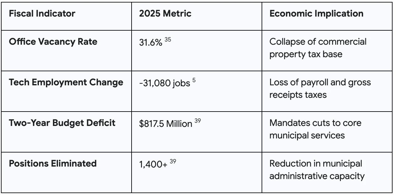This is most evident in the commercial real estate sector. The city has experienced a net negative absorption of 7.5 million square feet of office space, and the overall vacancy rate sits at a staggering 31.6%. This commercial hollowing out has profound, immediate fiscal implications. As office buildings are reassessed at vastly lower values, property tax revenues plummet. Furthermore, the departure of over 31,000 tech jobs from the city proper has severely reduced payroll and gross receipts business tax revenues.
